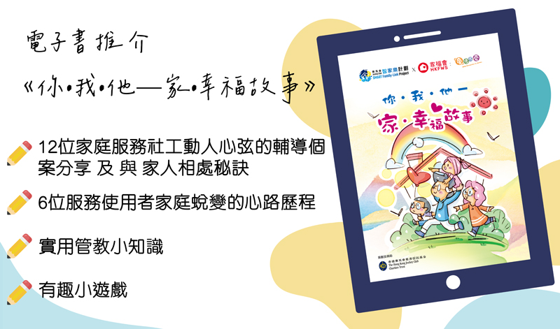 電子書推介 - 《你•我•他 — 家•幸福故事》 家福會「『童』步家•愛」計劃聯乘「賽馬會智家樂計劃」推出讀本 - 《你•我•他 — 家•幸福故事》,結集12位家庭服務社工動人心弦的輔導個案分享,以及與家人相處之道,同時收錄了六位服務使用者家庭蛻變的心路歷程,讓讀者透過此書,一同細味他們家庭故事中的喜與樂。書中亦節錄了一些實用管教小知識及趣味小遊戲,希望此書可以幫助讀者們,特別是家長,在育兒路上應對不同挑戰及困難,一起締造充滿愛與支持的家。