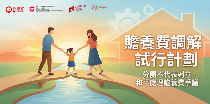 贍養費調解試行計劃 分開不代表對立,贍養費問題也可以有和平方法處理。本計劃由民政及青年事務局透過關愛基金撥款,為面臨離異的家庭提供免費專業的調解服務。調解員會協助雙方理性溝通,一站式處理贍養費、子女管養、婚姻居所及財產分配等安排。相比起訴訟,調解更為快捷、高效,並以子女福祉為先,以達成切實可行的協議。如有任何疑問或查詢,請致電2561 9229或瀏覽計劃網頁。