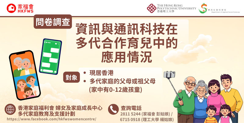 家福會x香港理工大學 – 「資訊與通訊科技在多代合作育兒中應用情況」問卷調查 在數碼年代,資訊與通訊科技(ICT)已成為跨代溝通及協作的主要渠道。過去研究顯示,社交媒體、視像通話、即時通訊軟件等工具,不單能拉近祖孫距離,更有助祖父母積極參與孫子女的成長及照顧。因此,我們希望藉是次調查了解香港資訊科技對跨代溝通的實際應用情況。誠邀現居香港、家中育有0-12歲孩童的多代家庭父母或(外)祖父母參與是次調查!