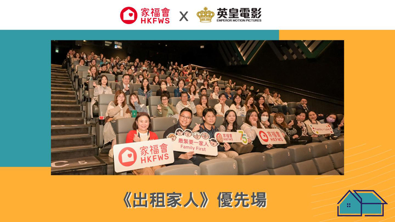 家福會 X 英皇電影 《出租家人》優先場 本會獲英皇電影支持,分別於2月及3月舉行了兩場《出租家人》電影優先場,共有超過200名合作伙伴、慈善機構友好、院校及贊助機構代表,以及服務使用者出席。活動亦邀請了《出租家人》的導演劉偉恒先生出席映後談,與大家分享拍攝過程及感受,並帶出家人並不局限於血緣關係,可以以不同形式來呈現及維繫的信息。