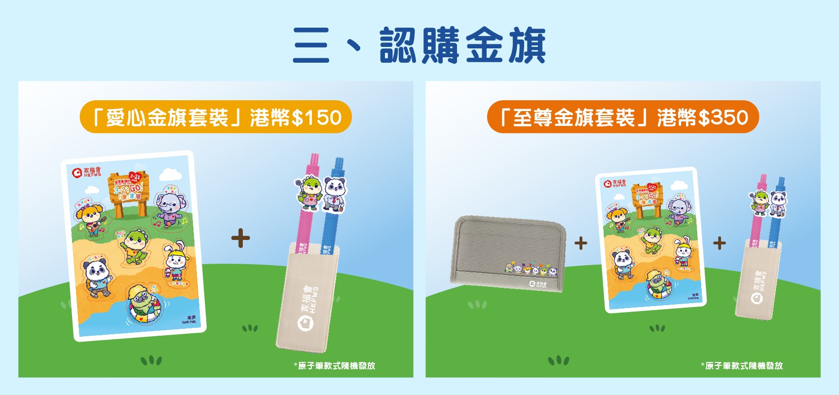 本會特別為今次全港賣旗日,設計了兩款精美的金旗套裝,以供認購。誠邀您認購金旗,一起傳播「家庭幸福」的信息。