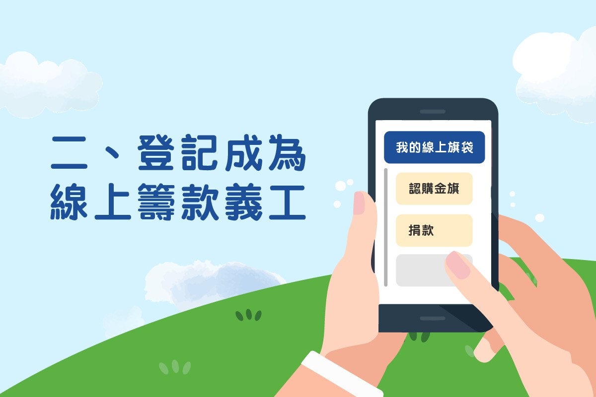 登記成為*線上籌款義工,即可獲派個人專屬的「線上旗袋」,只須以手機通訊軟件或社交平台分享,便可呼籲身邊人認購金旗套裝及捐款。籌得港幣$500或以上善款的線上義工,可獲頒發電子義工感謝狀乙張。